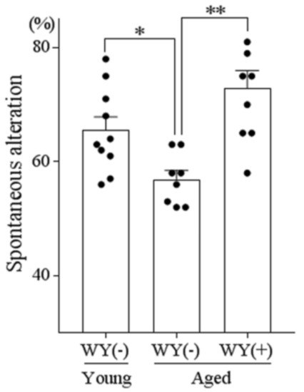 The effects of the WY peptide on aged mice: 7- and 22-month-old C57BL/6 mice were orally administered a daily dose 1 mg/kg of WY dipeptide for 14 days. At 1 h after oral administration of the peptide, mice were allowed to explore the Y-maze for 8 min. Data represent the mean ± SEM of 8–10 mice per group. The p values were calculated using one-way ANOVA followed by the Tukey–Kramer test. * p < 0.05 and ** p < 0.01.