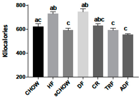 Total kilocalories consumed during the eight-week intervention period by male mice assigned to seven different dietary protocols. Values are mean ± SEM, n = 7–9 mice per group, using the Kruskal–Wallis test. Bars without a common letter differed. HF and DF > ADF (p < 0.001). HF > sCHOW (p = 0.010). HF > TRF (p = 0.009). DF > sCHOW (p = 0.016). DF > TRF (p = 0.014).