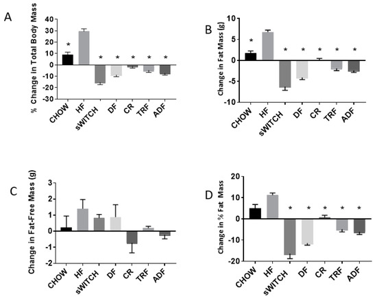 Percent change in total body mass (A), fat mass (B), fat-free mass (C), and percent fat mass (D) of male C57BL/6 mice assigned to different dietary protocols for eight weeks. Values are changed post-intervention as compared to pre-intervention. Values are mean ± SEM, n = 7–9 mice per group, In (A), * indicates a group effect for change in body mass: HF different from all groups (p < 0.001); in (B), * indicates a group effect for change in FM: HF different from all groups (p < 0.001); in (C), no group effect was observed (p > 0.050); and in (D), * indicates a group effect for change in % FM: HF different from sCHOW, DF, CR, TRF, and ADF (p < 0.001).