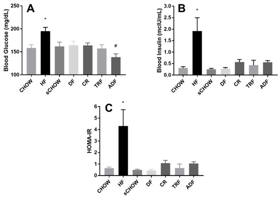 Post-intervention fasting blood glucose (A), fasting blood insulin (B), and HOMA-IR (C) of male C57BL/6 mice assigned to seven different dietary protocols for eight weeks. Values are mean ± SEM, n = 7–9 mice per group. (A) *A significant group effect noted: HF > all other groups (p < 0.050); # A significant group effect noted: ADF < sCHOW, DF, and CR (p < 0.050) (ANOVA); (B) *A significant difference noted: HF > Chow (p < 0.050), DF (p < 0.010), sChow, and TRF (p < 0.001); (C) *A significant difference noted: HF > sChow, DF, and TRF (p < 0.010) (Kruskal–Wallis).