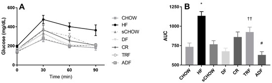 Post-intervention glucose tolerance test (A) area under the glucose curve (AUC) (B) of male C57BL/6 mice assigned to seven different dietary protocols for eight weeks. Values are mean ± SEM, n = 7–9 mice per group, ANOVA. (B) *A significant group effect noted: HF > CHOW, sCHOW, DF, CR, and ADF (p < 0.050); †† A significant group effect noted: TRF > DF and ADF (p < 0.050); # A significant group effect noted: ADF < CR (p < 0.050).