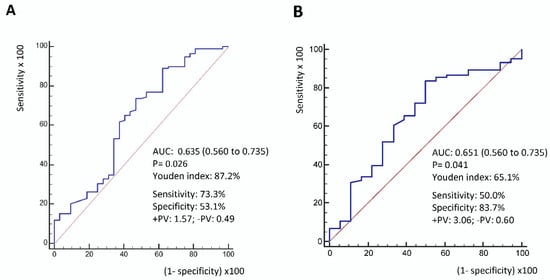 The best cut-off point for day 1-HLA-DR, as determined using the ROC curve and Youden index, was 87.2% (Figure 2A). Immune dysfunction was defined as patients with a day 1-HLA-DR < 87.2%, and patients with day 1-HLA-DR ≥ 87.2% were viewed as immune competent. Forty-seven (31.3%) patients had immune dysfunction. Patients with immune dysfunction were more likely to be older (71.0 vs. 65.6 years, p = 0.042) and have a lower BMI (21.7 vs. 24.0%, p = 0.007) (Table S1). The best cut-off point for day 7 caloric meet, as determined using the ROC curve and Youden index was 65.1% (Figure 2B). Patients were divided into high and low day 7 caloric meets, based on the above cut-off point. Twenty-five (20.5%) patients had a low day 7 caloric meet.