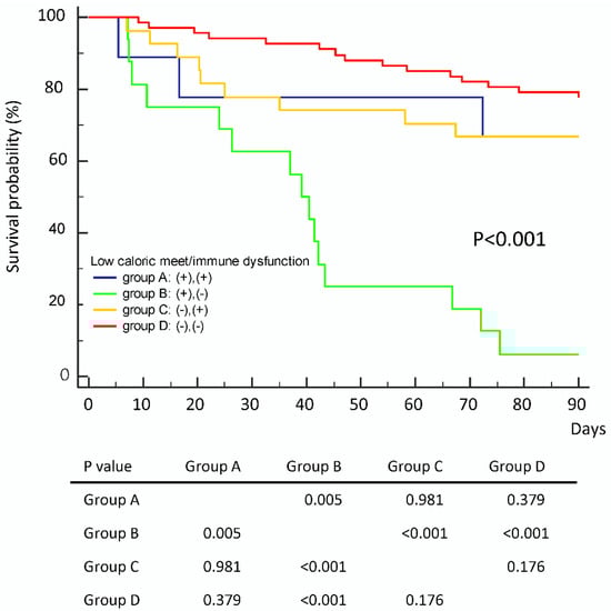 Patients were divided into four subgroups based on day 7 caloric meet and immune dysfunction status (Figure 3). Group A (n = 9): Patients with both low day 7 caloric meet and immune dysfunction; Group B (n = 16): Patients with low day 7 caloric meet, without immune dysfunction; Group C (n = 28): Patients with high day 7 caloric meet and immune dysfunction; Group D (n = 69): patients with high day 7 caloric meet, without immune dysfunction. Baseline clinical characteristics between the four groups of patients are shown in Table S2. Group D patients had the best prognosis (p = 0.379, p < 0.001, p = 0.176 when group D was compared to groups A, B, and C respectively). Group B patients had a worse prognosis (p = 0.005, p < 0.001, p < 0.001 when group B was compared to groups A, C and D respectively) (Figure 3). In the subgroup of patients with immune dysfunction, insufficient nutrition had no influence on survival outcomes (p = 0.981). Surprisingly, insufficient nutrition patients had a poor prognosis only when they were immune competent (p < 0.001).