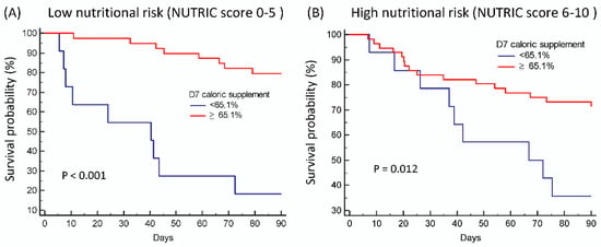 Patients were divided into high nutritional risk if they had a NUTRIC score of 6–10 and low nutrition risk if they had a NUTRIC score of 0–5. Of the 122 patients available for NUTRIC scoring, 71 (58.2%) patients were categorized as high nutritional risk and 51 (41.8%) patients as low nutritional risk. Patients with a lower day 7 caloric meet had poor prognosis, both in those with low (Figure 4A) and high (Figure 4B) nutritional risk (p < 0.001 and p = 0.012 respectively).