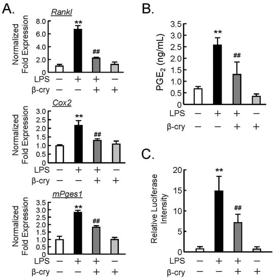 The effects of β-cry on the LPS-induced expression of cyclooxygenase (COX)-2, membrane-bound PGE synthase (mPGES)-1, and receptor activator of NF-κB ligand (RANKL) mRNA on the production of prostaglandin (PG)E2 in osteoblasts. Primary osteoblastic cells (POBs) were pre-treated with β-cry (5 µM) for 24 h and further cultured for 24 h in the presence of LPS (1 µg/mL) and β-cry (5 µM). (A) The mRNA expression of RANKL, COX-2, and mPGES1 was analyzed by RT-qPCR. Data are expressed as the mean ± SD of three replicated wells in triplicate. (B) The PGE2 concentration was measured in the cultured medium of POBs. (C) The transcription activity of NF-κB was measured with or without β-cry (5 µM). Plasmid pNFkB-TA-Luc (0.4 µg) and the pGL4.74[hLuc/TK] plasmid (40 ng) were transfected into POBs, and the luciferase activity was measured with the Dual-Luciferase Reporter Assay System. Data are expressed as the mean ± SD for 3–4 independent wells. Significant differences are indicated, ** p < 0.01 vs. control; ## p < 0.01 vs. LPS.
