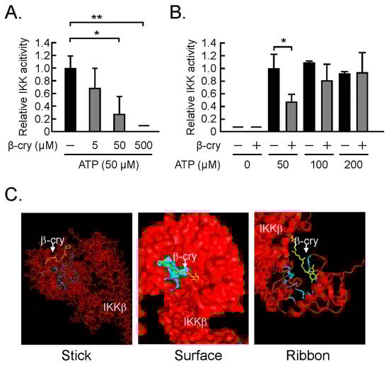 The direct action of β-cry on inhibitor of NF-κB kinase (IKK) activity in an in vitro assay. The IKK activity was elucidated by the IKK activity assay kit using IKKβ, IκBα, and anti-phospho-IκBα antibody. (A) The effects of β-cry on the IKK activity. (B) ATP was added to the IKK assay with β-cry, and the IKK activity was expressed as the percentage of the control without β-cry. Data are expressed as the mean ± SD for three independent wells. Significant differences are indicated, * p < 0.05, ** p < 0.01. (C) Predicted binding model of β-cry docked into a homology of IKKβ. The 3D images of the ligand binding model are shown as three models. The colors in the three images were indicated as follows: yellow (β-cry), red chain (IKKβ), and light blue (active site in IKKβ).