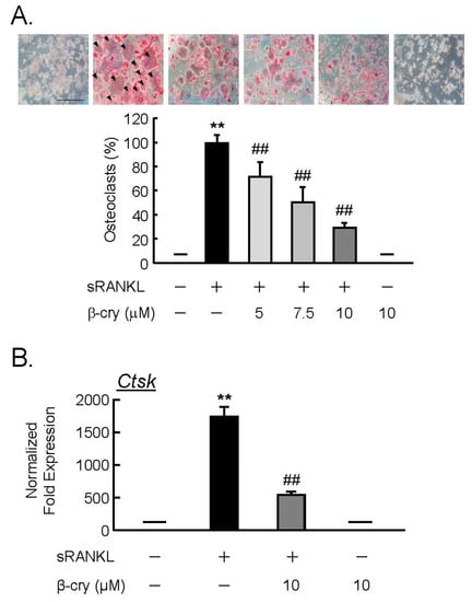 In order to test the direct action of β-cry on osteoclast precursor cells, RAW264.7 cells were cultured for four days with sRANKL (100 ng/mL) and β-cry (5–10 µM). β-cry suppressed the RANKL-induced osteoclast differentiation in a dose-dependent manner, as seen in Figure 4A. The mRNA expression of cathepsin K (Ctsk) was elevated by RANKL in RAW264.7 cells, but this increase was repressed by adding β-cry to the real-time PCR analysis, as seen in Figure 4B.