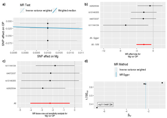 MR study of Mg and OP: (a) A graph that correlates the effect size of the SNP-Mg association (x-axis, SD units) and the SNP-OP association (y-axis, log OR) to the standard error bars. The slope of the line corresponds to a causal estimate using a different method. (b) The forest map, where each black dot represents a single SNP as IV, shows the logarithm of the odds ratio (OR) per standard deviation (SD) under the influence of mineral magnesium; the red dot shows the use of the IVW results for all SNPs; the horizontal line indicates the 95% confidence interval. (c) The leave-one-out method sensitivity analysis. Each black dot represents an IVW method for estimating the causal effect of the Mg element on OP and does not exclude a case where a particular SNP causes a significant change in the overall result. (d) The funnel plot shows the estimation using the inverse of the standard error of the causal estimate using each individual SNP as a tool. The vertical line shows the results of the IVW method using all SNPs.