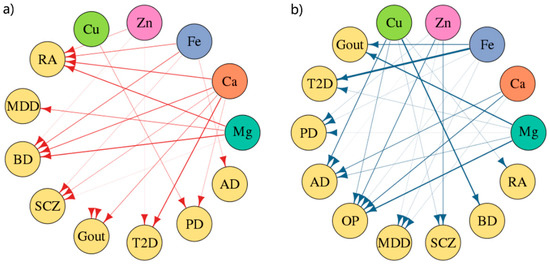 Despite the great advances that have been made in the prevention and treatment of chronic diseases, such as osteoporosis (OP), gout, rheumatoid arthritis (RA), type 2 diabetes (T2D), Alzheimer’s disease (AD), bipolar disorder (BD), schizophrenia (SCZ), Parkinson’s disease (PD), and major depressive disorder (MDD), the etiology and mechanisms of many diseases are not fully understood [1,2]. A better understanding of causal mechanisms will enable the prevention of chronic diseases, direct the launch of proper clinical trials, and provide targets for effective lifestyle and pharmacological interventions. Understanding which clinical risk factors should be targeted to reduce the risk of chronic diseases is important. Some observational studies have shown that there is a close relationship between minerals and human diseases. For instance, moderate calcium (Ca) supplementation helps reduce T2D risk [3]; higher magnesium (Mg) is negatively associated with OP and AD [4,5]; iron (Fe) and Zn are negatively correlated with MDD [6]; and Mg, copper (Cu) and zinc (Zn) are positively correlated with RA [7] (Supplementary Table S1). However, these observational findings are difficult to interpret because these results are also affected by a variety of confounding factors, such as occupational and environmental exposures, diet, and supplement use [8].