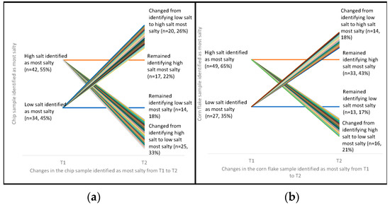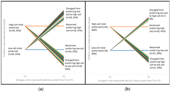Participants’ most preferred potato chip (a) and cornflake (b) samples at T1 and T2 1,2,3,4,5; 1 Chip McNemar’s Test, p > 0.99; 2 Cornflake McNemar’s Test, p = 0.36; 3 “Low salt” group includes both low and mid salt samples; 4 n = 2 participants missing from corn flake graph due to recording errors at data collection. n = 1 missing data for T1 and n = 1 missing data for T2; 5 The ‘change’ lines are a visual representation of the number of children who changed their preference from T1 to T2—each color is a different child. As the graph is showing the changes in preference over time, the ‘remain’ lines stay the same thickness at both times points—this thickness does not represent the proportion of children who remained preferring the same sample.