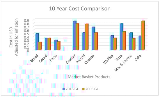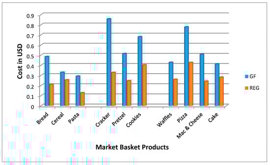 Celiac disease is a genetically mediated autoimmune disease that, if left untreated, is associated with inflammation and damage of the small intestine that can lead to malabsorption, infertility, osteoporosis, lymphoproliferative malignancy, and other autoimmune diseases [1]. The only treatment for celiac disease is lifelong adherence to a gluten free diet (GFD). A GFD eliminates all wheat, rye and barley—the most ubiquitous grains used for staple food products including bread, pasta, cereal, crackers, and snacks. There are many naturally GF grains that can be used to manufacture substitutes for gluten containing foods such as bread, pasta and cereals. As the naturally GF grains and flours (e.g., quinoa, millet, teff, sorghum, buckwheat) are not mainstream items, the cost of the GF products is often more expensive than their gluten containing counterpart. The economic burden of the GFD has been previously documented in the United States (U.S.) [2], in Europe, Canada, Saudi Arabia, Iran and Chile [3,4,5,6,7,8]. However, with the onset of mainstream food manufacturers entering the GF market, a more recent evaluation of the cost and availability differences between GF products and their wheat-based counterparts is warranted.