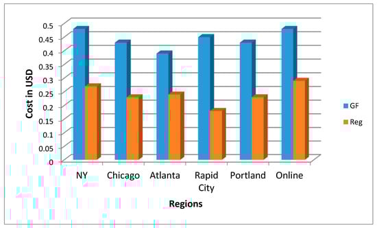 There were statistically significant differences in the prices across the different regions (p < 0.001). The largest difference in price was found in Rapid City, where GF products were 245% more expensive than their wheat-based counterparts (Figure 3). The Atlanta region had the least cost difference, with GF products being 162% more expensive. The different regions had variation in price per product as well. In New York, the most expensive GF product was pasta, which was 330% more expensive than the wheat-based pasta. In Rapid City, bread was the most expensive item—377% more expensive. Crackers were the most expensive item in Chicago, Atlanta, and Portland. Crackers in Chicago were 310% more expensive than wheat-based crackers whereas in Portland, they were 289% more expensive and in Atlanta, they were 248% more expensive per ounce.
