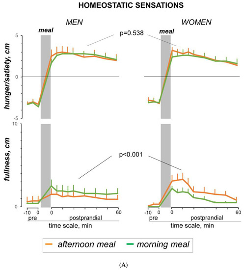 The activity of the digestive system changes in response to ingestion of a meal from a stereotyped fasting pattern to a tightly controlled digestive pattern, which is part of the broader homeostatic response to the meal [1,2]. Ingestion also induces sensations, both homeostatic (satiation, fullness) and hedonic (meal wanting, liking, digestive well-being, changes in mood), depending on the characteristics of the meal [1]. The responses also depend on the predisposition of the eater, which can be modulated by a series of conditioning factors, such as previous meals, e.g., breakfast on the study day [3], how palatable the meal is found to be [4], and cognitive factors [5]. In this context, we hypothesized that the eating time also plays a conditioning role, specifically, that an extemporaneous meal is less enjoyable than when eaten within the habitual schedule. The effect of meal schedule on the postprandial experience may be highly relevant due to its potential influence on eating habits, energy balance, and the control of body weight [6,7,8].