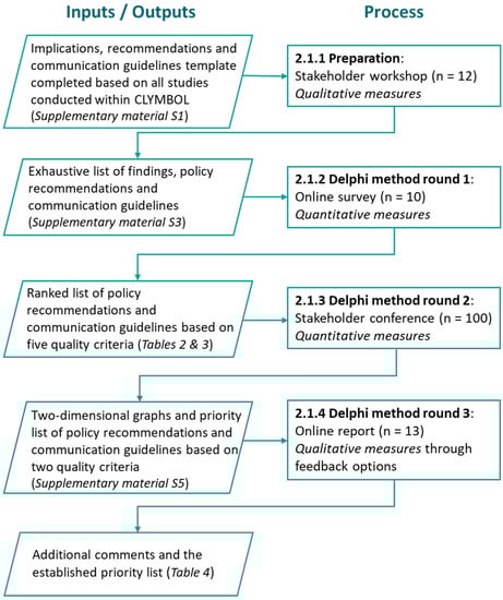 The present study prioritizes qualitative insights using quantitative data. Key findings from earlier studies within the four CLYMBOL work areas formed the basis for formulating evidence-based policy recommendations and communication guidelines. Since these recommendations and guidelines were formed for EU policy directed towards the regulation and provision of health claims and symbols, active involvement of stakeholders from various sectors was required to warrant meaningful insights. Specific questions were to what extent recommendations and communication guidelines are relevant to the stakeholder’s organization and how feasible they rate their implementation in practice. This has been studied using the Delphi method. Formal expert elicitation through the Delphi method is a structured communication process that allows a heterogeneous group of experts to share views, build consensus, and deal with a complex problem [,]. One of the advantages of the Delphi method is that the aggregated response from a group of experts is expected to be less prone to “mistakes” []. This method has been applied for policy planning since the 1970s [], and it remains popular in public food and health policy development [,].