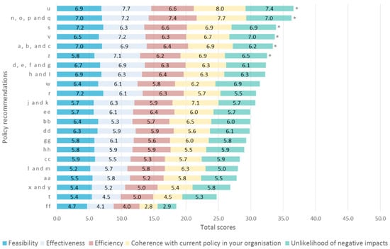 Stakeholder evaluation of policy recommendations based on the five quality criteria (n = 10). The vertical axis indicates the numbering of policy recommendations as in Table 2. The horizontal axis denotes the score that each (group of) item(s) received. The total scores range from 5 to 50, but the axis is set to start at 0.0 in order to show the correct proportions of ratings for the quality evaluation criteria. The numbers inside the five sections of each bar correspond with the average scores on the criteria. The total scores do not differ significantly among items based on Friedman non-parametric test (p-value = 0.078). The asterisks (*) indicate the items selected for the Delphi round 2.