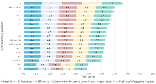 Stakeholder evaluation of communication guidelines based on the five quality criteria (n = 10). The vertical axis indicates the numbering of communication guidelines as in Table 2. The horizontal axis denotes the score that each (group of) item(s) received. The total scores range from 5 to 50, but the axis is set to start at 0.0 in order to show the correct proportions of rating for the quality evaluation criteria. The numbers inside the five sections of each bar correspond with the average scores on the criteria. The total scores do not differ significantly among items based on Friedman non-parametric test (p-value = 0.080). The asterisks (*) indicate the items selected for the Delphi round 2.