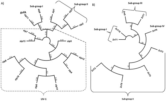 Phylogenetic relationships of the human ZnT and ZIP proteins (SLC30A & SLC39A family of zinc transporters). Protein sequences were attained by converting human SLC39A and SLC30A mRNA into amino acids sequences and aligned by Geneious alignment using global alignment. The dendrogram was generated from Geneious tree builder utilizing the Jack-knife method. Molecular phylogenetic analysis as generated by the genetic distance model “Jukes-Cantor”, the re-sampling method used Jack-knife with 229,871 random seeds. (A) Phylogenetic relationships of SLC39A family (ZIP), (B) Phylogenetic relationships of SLC30A family (ZnT).