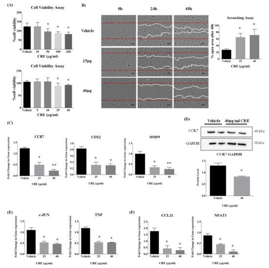 Although the exact pathway of breast cancer metastases is unknown, recently several markers correlated with metastasis have been identified through a genome-wide expression analysis by large-scale studies [3,30]. In order to determine which signal paths and genes are affected by CRE and leading to anti-metastatic effects on MCF7 cells, we further investigated several key regulators. There was a significant change at transcriptional levels of metastasis-related genes; specifically, COX2 (Cyclooxygenase 2), CCR7 (C-C Chemokine Receptor Type 7), and MMP9 (Matrix Metalloproteinase 9) mRNA levels (Figure 2C) were significantly decreased 48 hours after the CRE treatment, in a dose-dependent manner. Consistent with the mRNA results, there was also a reduction at CCR7 protein level (Figure 2D). In addition to the metastasis markers, CRE inhibited the gene expression of c-JUN (JUN proto-oncogene, AP-1 Transcription Factor Subunit) and TNF (Tumor Necrotic Factor), which play a role in cell apoptosis and cell inflammation, respectively (Figure 2E). As shown in Figure 2F, CRE significantly reduced the mRNA expression level of CCL21 (C-C motif Chemokine Ligand 21), which has a receptor-ligand relationship with CCR7 [31]. The mRNA level of NFAT1 (Nuclear factor of activated T cells 2) was also decreased, inducing COX2 expression and triggering cell invasive migration [32].