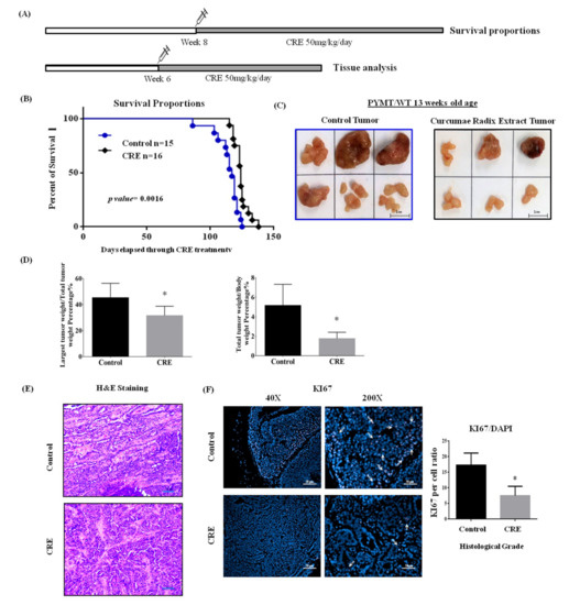 Ethanol extract of Curcumae radix prolongs survival rates of MMTV-PyMT transgenic mice. (A) For survival experiment, CRE administration was started at 8 weeks of age and continued until death of animal. For short term analysis, CRE administration was started at 6 weeks of age and mice were sacrificed at the beginning of 13 weeks. (B) Graphic represents Kaplan–Meier survival analysis over time with control vs. CRE treatment. The p-value was determined by using log–rank test. (C) Gross appearance of excised tumors at 13 weeks of age PyMT transgenic females with/without CRE treatment. Representative images of tumors excised from control and CRE group. Increased tumor size and larger necrotic areas were observed in the tumors excised from control group. (D) Total tumor weight and single largest tumor weight significantly decreased in CRE treated PyMT transgenic female mice. Values represent means ± S.E.M. * p < 0.05 vs. control. (E) Representative histological images taken of tumors derived from 13 weeks of age PyMT transgenic females with/without CRE treatment. Slides were microscopically examined and images taken. There was no significant difference at tumor grade and malignant progression between each group. Histologically, the tumors were carcinomas ranges from low to medium grade. Scale bars = 50 µm. (F) Curcumae radix extract suppressed cell proliferation in vivo. Immunohistochemistry staining against Ki67 in tumor tissues was done and representative images of tissue sections from each group were taken at 200× and 40× magnification. Scale bars = 50 µm. Histogram data was presented as mean ± SEM. * p < 0.05 vs. control.