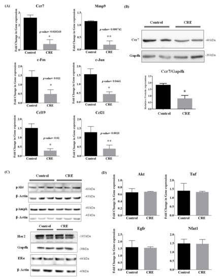We demonstrated that Curcumae radix extract inhibited cell migration by suppressing the expression of the metastasis-related genes CCR7, MMP9, COX2 and their downstream genes, in MCF7 cells. Next, we further investigated whether these key regulators were affected by Curcumae radix extract in vivo. As shown in Figure 4A, the mRNA levels of Ccr7, Mmp9, c-Fos (Fos proto-oncogene, AP-1 transcription factor subunit), c-Jun (Jun), Ccl19 (C-C motif Chemokine Ligand 19) and Ccl21 were significantly reduced in tumor of CRE treated mice. c-Jun (Jun) and c-Fos assemble together to form the Activator Protein-1 (AP-1), which has a role in DNA binding, and acts as transcriptional activator during exponential growth [35]. Consistent with the mRNA result, also the protein level of Ccr7 was decreased upon CRE treatment (Figure 4B). Ccl19 has a receptor-ligand relationship with Ccr7, as well as Ccl21 [31]. The breast cancer markers Estrogen Receptor alpha (ERα) and Human Epidermal Growth Factor Receptor 2 (HER2) were examined at protein level (Figure 4C), however there was no significant difference between the two cohorts. Other key regulators for different signal pathways were also examined; however, no significant difference was found either at mRNA or protein levels (Figure 4C,D).