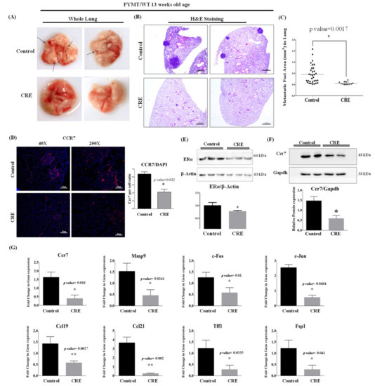 Gross and histological appearance of lung excised from 13 weeks of age PyMT transgenic females. CRE treated PyMT transgenic females showed decreased frequency of mammary tumor-derived lung metastases. (A) Representative photos of whole lung excised from 13 weeks age of control group (upper side) and CRE group (bottom side). Larger and more visible metastatic foci were observed in control group. (B) Hematoxylin and eosin (H&E) staining was done with lung samples excised from 13 weeks of age PyMT transgenic females with/without CRE treatment. Slides were microscopically examined and images taken. The number and size of metastases significant decreased in PyMT transgenic females with CRE treatment Scale bars = 400 µm. Curcumae radix extract suppresses frequency of PyMT mammary tumor-derived lung metastases and tumorigenesis by inhibiting CCR7 and its downstream genes in lung of PyMT transgenic mouse. (C) The distribution of sizes of metastatic foci in control group (n = 7) and CRE group (n = 6) lungs as mean ± SEM. * p < 0.05 vs. control. (D) Immunohistochemistry staining against Ccr7 in lung tissues was done and representative images of tissue sections from each group were taken at 200X and 40X magnification. Scale bars = 50µm. Histogram data was presented as mean ± SEM. * p < 0.05 vs. control. (E) Western blot of proteins extracted from lung tissues against ERalpha and β-actin. * p < 0.05 vs. control. (F) Level of Ccr7 protein in lung tissues was analyzed by Western blot. Gapdh was used as an internal control. * p < 0.05 vs. control. (G) To investigate level of transcripts associated with breast cancer metastasis the expression levels of Ccr7, c-Fos, Mmp9, Ccl21, Ccl19, Ps2, Fsp1 and Jun were monitored by qRT-PCR. β-actin gene was used as an internal control in real time PCR. Values represent means ± S.E.M. n = (3); * p < 0.05 and ** p < 0.005 vs. control.