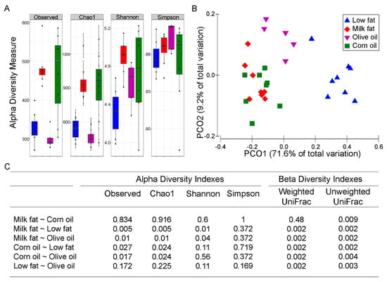 The effect of lipid diets on the diversity of the gut microbiota. (A) Alpha diversity of colonic microbiota from mice fed high fats diets composed of low-fat chow (blue), milk fat (red), olive oil (purple) or corn oil (green). Observed species richness, Chao1, Shannon’s, and Simpson’s indexes are displayed. (B) PCoA plot of the weighted UniFrac distances of colonic microbial communities from mice fed high-fat diets composed of milk fat, olive oil, corn oil or low-fat chow. The first two principal components from the PCoA are plotted. (C) Statistical summary (p-values after Benjamini–Hochberg adjustment for multiple comparisons) of all alpha and beta diversity measures.