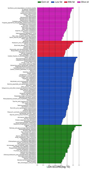 The effect of lipid diets on predicted microbial functions. Statistically and biologically differentially abundant pathways amongst the four dietary group shown as a histogram of the LDA scores. The length of the bars represents a log10 transformed LDA score set to a threshold value of 2. The one-to-all version of LEfSe was used with Kruskal–Wallis test (P < 0.05).