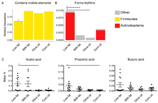 Predicted bacterial virulence traits and quantified secondary metabolites. Virulence traits such as (A) the relative abundance of bacteria which contain mobile elements and (B) the relative abundance of bacteria which are able to form biofilms are displayed for each diet group. (C) The effect of lipid diets on short-chain fatty acid production. Short-chain fatty acid analysis performed via gas chromatography on cecal samples from mice fed high-fat diets composed of milk fat, olive oil, corn oil or a low-fat chow. Acetic, propionic, and butyric acid are expressed as mass % of total cecal tissue sample. Values are expressed as mean +/− SEM (n = 8–12). An asterisk above a single column indicates P < 0.05 for that group compared to every other dietary group. An asterisk with a line connecting two groups indicates P < 0.05 between the two groups.