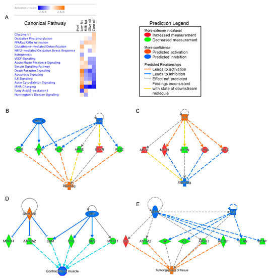 The milk fat dietary group had upregulated acute phase response (Figure 5A). Acute phase proteins are defined as proteins which are increased by at least 25 percent during inflammation and includes proteins such as apolipoprotein A1, ferritin, haptoglobin, interleukin-1 receptor antagonist protein, and serpin family A member 3, which were all upregulated in the milk fat group (Table 1). While not included in the IPA derived pathway, alpha-1 acid glycoprotein 1 was similarly upregulated and is involved in acute phase response. The milk fat group was the only high-fat diet to have upregulated fatty acid β-oxidation 1 and sirtuin signaling. Previous studies have shown that the sirtuin signaling pathways link inflammation and metabolism particularly protective restitutive responses helping to resolve inflammation [48]. Of the 22 proteins utilized in the IPA sirtuin signaling pathways, 6 were upregulated in the milk fat group including ATP synthase F1 subunit beta, H1 histone family member 0, NADH: ubiquinone oxidoreductase subunit A9, NADH: ubiquinone oxidoreductase core subunit S3, and voltage dependent anion channel 1. In contrast to the corn oil and olive oil dietary groups, IPA did not generate a hypothesis to explain how activation or inactivation of regulators leads to an increase or decrease of function in the milk fat group. Given these data, milk fat appears to have increased expression of inflammatory pathways.