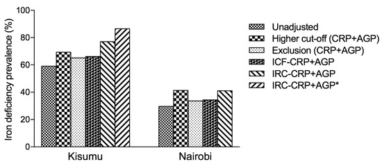 The estimated prevalence of iron deficiency increased after the ICF approach was used to adjust ferritin concentrations in comparison with the unadjusted prevalence (Table 2). Thus, the estimated prevalence of iron deficiency in Kisumu increased from 52.8% (all women) to 66.4% (excluding cases with Plasmodium infection, with adjustment for CRP and AGP), whilst the prevalence estimate in Nairobi increased from 29.9% to 34.6%.