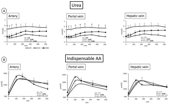 | Arginine | Gut | −75 ± 231 | 234 ± 41 | 638 ± 74 | 0.14 |