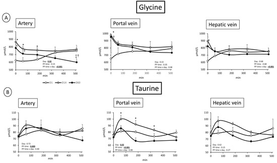 | Glutamate | Gut | −357 ± 268 a | −1023 ± 228 b(t) | −567 ± 72 a | 0.04 |