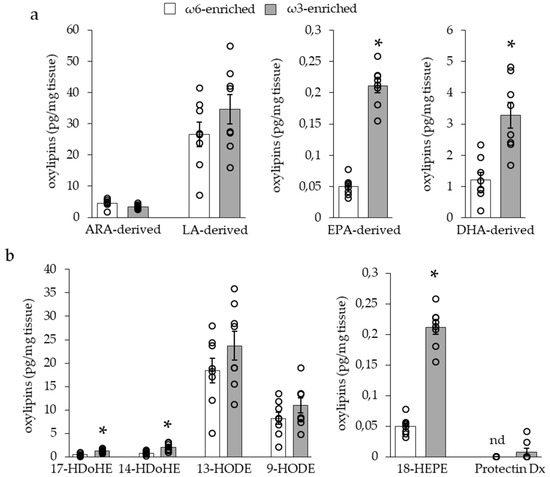 It is interesting to note that the ω3 PUFA intake finely drives the kind of oxylipins synthesized. A recent study analyzed the effect of an ω3 PUFA dietary supplementation of an already equilibrated diet (ratio ω6/ω3 = 6.7) to reach an ω6/ω3 ratio of 0.8. Thus, differently to our situation, LA and LNA are already desaturated equivalently, and the increase in ω3 PUFA intake leads to a decrease of LA-derived oxylipins (9/13-HODEs) in favor of EPA and DHA derived oxylipins in the brain. Moreover, this “over”-supplementation ameliorates against an inflammatory response [71].