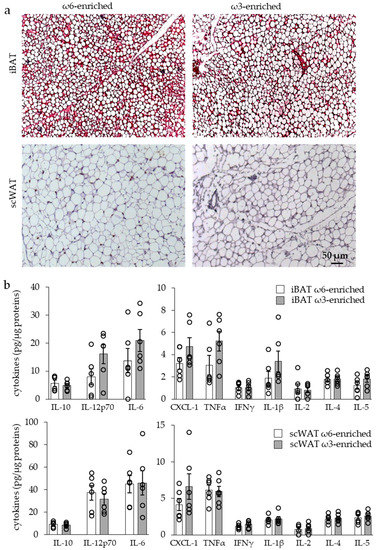 Inflammatory profile of iBAT and scWAT of mice submitted to ω6- or ω3-enriched diet. (a) Hematoxylin and eosin staining of tissue sections. (b) Analysis of adipose tissue cytokine levels. Results are displayed as independent mouse values (dots) and mean ± SEM (histograms). n = 6. *, p < 0.01.