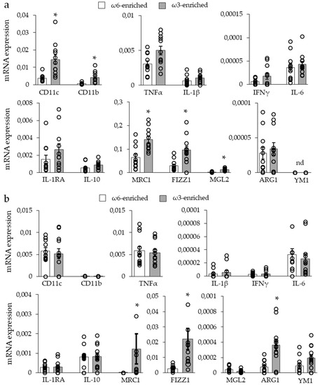 Altogether, these results demonstrated that an ω3-enriched diet led to a general increase in M2 anti-inflammatory macrophage marker expression without modification in M1 pro-inflammatory markers. This was correlated and perhaps due to the increased amount of substrates for pro-resolving mediator synthesis, as well as an increased quantity of M2 polarizing oxylipins.