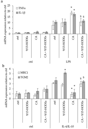 Macrophage marker expression in THP-1 cells under 9- and 13-HODE treatment. mRNA level analysis by RT-qPCR of M1 (TNFα, IL-1β) and M2 (MRC1, TGM2) macrophage markers in control, lipopolysaccharides (LPS) (upper panel) or IL-4/IL-10 (lower panel) treated THP-1 macrophages. Cells were co-treated for 48 h with carnosic acid (CA, 10 µM) and or 9- and 13-HODEs. (a) CA treatment induced opposite effects in M1- and M2-like macrophages as it increased inflammatory markers in THP-1 M1-like macrophages, and (b) decreased M2-like macrophages’ markers. Histograms display mean ± SEM. n = 3. *, p < 0.01 vs. ctrl and $, p < 0.01 vs. CA.