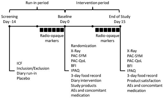 The study setup. AEs—adverse events; BFI—bowel function index; ICF—informed consent form; IPAQ—international physical activity questionnaire; PAC-SYM—patient assessment of constipation symptoms; PAC-QoL—patient assessment of constipation quality of life. ■, radio-opaque markers were consumed at the study site from Day -6 to Day -1 during the run-in period and from Day 9 to Day 14 during the intervention period.