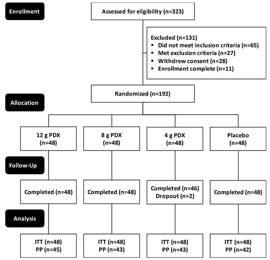 The eligible participants were randomized into 4 groups, with 48 participants in each group (Figure 2). The 4 groups received 12 g, 8 g, or 4 g of PDX or placebo. Two participants in the 4 g PDX group dropped out of the study between their baseline visit and end of study. Nineteen participants were excluded from the PP population. The results in the PP and ITT populations were similar; thus, we report the results from the ITT population as representative of all participants who enrolled in the study. Altogether, 190 participants completed the study, and all 192 participants were included in the ITT analysis. The intervention took place from 27 April 2015–15 April 2016. The study was finalized when the GCP study report was completed on 14 September 2016.