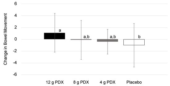 Changes in bowel movement from the baseline to the end of study (p = 0.017). Bars with letters are significantly different after Dunnett’s correction (p ≤ 0.05).