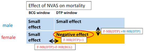 Figure 1. Illustration of Hypothesis B and its derived deductions. Note: F-MR(BCG) signifies NVAS/placebo mortality ratio in BCG-vaccinated females; F-MR(DTP) and M-MR(DTP) signifies NVAS/placebo mortality ratio in DTP-vaccinated females and males, respectively.