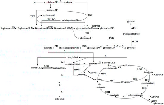 Pathway of fatty acid transformation in G. geotrichum. hexokinase (HK, EC2.7.1.1), transketolase (TKT, EC2.2.1.1), transaldolase (TALDO, EC2.2.1.2), phosphofructokinase (PFK, EC2.7.1.11), glyceraldehyde 3-phosphate dehydrogenase (GAPDH, EC1.2.1.12), phosphoglycerate kinase (PGK, EC2.7.2.3), triose-phosphate isomerase (TPI, EC5.3.1.1), enolase (ENO, EC4.2.1.11), pyruvate kinase (PK, EC2.7.1.40), malate dehydrogenase (MDH, EC1.1.1.37), citrate synthase (CS, EC2.3.3.1), aconitase (ACO, EC4.2.1.3), isocitrate dehydrogenase (IDH. EC1.1.1.41 and EC1.1.1.42), glutamate dehydrogenase (GLUD, EC1.4.1.2 and EC1.4.1.3), phosphoenolpyruvate carboxykinase (PCK, and EC4.1.1.32 EC4.1.1.49), succinate dehydrogenase (SDH EC1.3.5.1), alcohol dehydrogenase (ADH, EC1.1.1.2), phosphoglycerate kinase (GLYCTK, EC2.7.1.31), aldehyde dehydrogenase (ALDH, EC1.2.1.3), isocitrate lyase (ICL, EC4.1.3.1), methionine synthase (MS, EC2.1.1.13), and n.- enzymes, whose content in the sample cannot be identified the method used (own work on the basis of Wang et al. [63]).