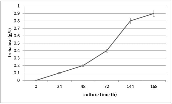 The enzyme alpha,alpha-trehalose-phosphate synthase was found in the proteome of G. geotrichum 38. This enzyme catalyzes the transfer of glucose from uridine diphosphate (UDPglucose) to glucose-6-phosphate to form trehalose-6-phosphate. This step is followed by the hydrolysis of trehalose-6-phosphate to trehalose. The enzyme trehalose-6-phosphate phosphatase is involved in the above process [15]. The trehalose content of the culture systematically increased, and after 168 h of culture had reached 0.91 g/L (Figure 2). One microorganism known to be capable of biosynthesizing trehalose is Propionibacterium spp. The agents that stimulates trehalose biosynthesis by Propionibacterium spp. are lactose [73] and glycerol [74].