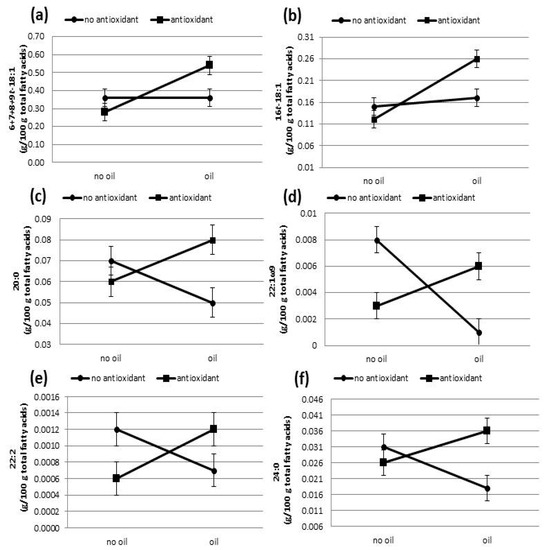 There was an effect of the interaction between oil and oxidant supplementation for 6 + 7 + 8 + 9t-18:1 (p = 0.032), 16t-18:1 (p = 0.003), 20:0 (p = 0.004), 22:2 (p = 0.036), and 24:0 (p = 0.026) fatty acids in milk and a trend for 22:1ω9 (p = 0.076, Figure 1). All of these fatty acids had increased concentrations in milk when the cows’ diet was supplemented with antioxidants along with oil.