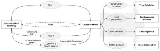 Subclinical B12 deficiency has also been implicated in many age-related diseases that are related to these functions and connections, such as schizophrenia, type 2 diabetes (T2D), Alzheimer’s disease, and Parkinson’s disease [14,15,16,17]. Notably, such age-related diseases share a commonality; oxidative stress is believed to be an important factor in their pathophysiology [5,13,18].