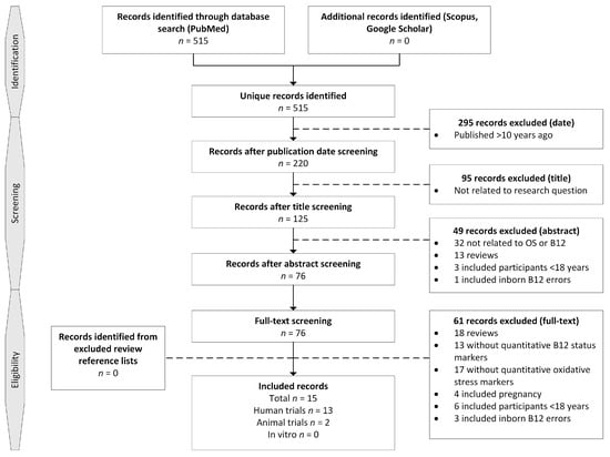 Searches using the keywords oxidative stress, vitamin B12, and cobalamin were performed in Scopus and Google Scholar to identify additional publications. Reference lists from relevant reviews obtained through the search strategy were also searched. In total, 515 unique records were identified on 8 November 2017 (Figure 2).