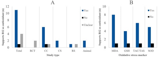 Including all disease phenotypes, species, study types, and other population characteristics, nine out of 15 studies supported the antioxidant properties of B12 (60%), one did not (6.7%), and five showed unclear results (33.3%) (Figure 3A). Five CC studies, one CS, one RS, and two animal studies supported B12 as an antioxidant. Notably, the potential antioxidant effect of B12 was unclear for both RCTs due to their broad-spectrum micronutrient interventions.