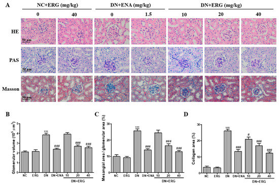 Effects of ergosterol on histopathological changes in the renal tissues of STZ-induced diabetic mice. (A) Representative hematoxylin-eosin (HE), periodic acid-Schiff (PAS) and Masson staining in kidneys from formalin-fixed kidney sections taken from the mice of each group (n = 6/group) at 8 weeks. (B–D) Quantitative assessment of glomerular volume, mesangial area (%), and collagen area (%). NC: normal control; DN: diabetic nephropathy; ENA: enalaprilat administration; ERG: ergosterol administration. *** p < 0.001 compared with NC; # p < 0.05, ### p < 0.001 compared with DN.