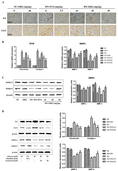 Ergosterol alleviated extracellular matrix (ECM) accumulation. (A) Representative renal sections with immunohistochemical staining of fibronectin and collagen I. (B) Expression of fibronectin, collagen I, MMP-2, and MMP-9 mRNA levels in renal parenchyma (data are presented as the means ± SD, n = 3). (C) Expression of MMP-2 and MMP-9 protein levels in renal parenchyma through Western blotting (data are presented as the means ± SD, n = 3). (D) Expression levels of fibronectin, collagen I, MMP-2 and MMP-9 in RMCs cultured under different conditions through Western blotting (data are presented as the means ± SD, triplicate). NC: normal control; DN: diabetic nephropathy model induced by STZ; ENA: positive control, 1.5 mg/kg/day enalaprilat administration; ERG10, ERG20, ERG40: 10, 20, 40 mg/kg/day ergosterol administration, respectively. NG: normal glucose, 5.6 mM glucose; Mannitol: 5.6 mM glucose + 24.4 mM mannitol; HG: high glucose, 30 mM glucose; ERG10 and ERG 20: 10 and 20 μM ergosterol, respectively. ** p < 0.01, *** p < 0.001 compared with NG or NC; # p < 0.05, ## p < 0.01, ### p < 0.001 compared with HG or DN.