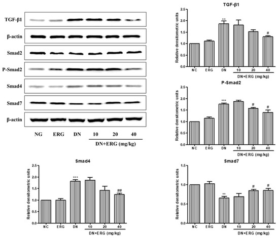 Ergosterol inhibited the renal transforming growth factor-β1 (TGF-β1)/ drosophila mothers against decapentaplegic 2 (Smad2) signaling pathway in STZ-induced diabetic mice. This figure shows these results of Western blot analysis of TGF-β1, Smad2, phosphor-Smad2, Smad4, and Smad7. NC: normal control; DN: diabetic nephropathy model induced by STZ; ERG10, ERG20, ERG40: 10, 20, 40 mg/kg/day ergosterol administration. Data are presented as the means ± SD, n = 3. ** p < 0.01, *** p < 0.001 compared with NC; # p < 0.05, ## p < 0.001 compared with DN.