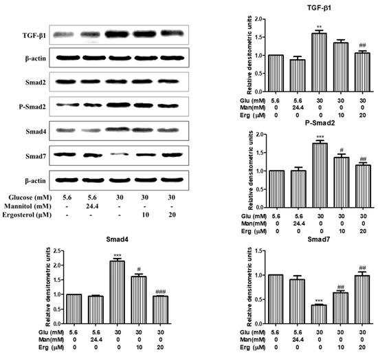 Ergosterol inhibited the TGF-β1/Smad2 signaling pathway in RMCs exposed to high glucose. This figure shows the expression levels of TGF-β1, Smad2, phosphorated-Smad2, Smad4, and Smad7 in RMCs cultured under different conditions through Western blotting. Glu: glucose; Man: mannitol; Erg: ergosterol. Data are presented as the means ± SD, performed in triplicate. ** p < 0.01, *** p < 0.001 compared with normal glucose; # p < 0.05, ## p < 0.01, ### p < 0.001 compared with high glucose.